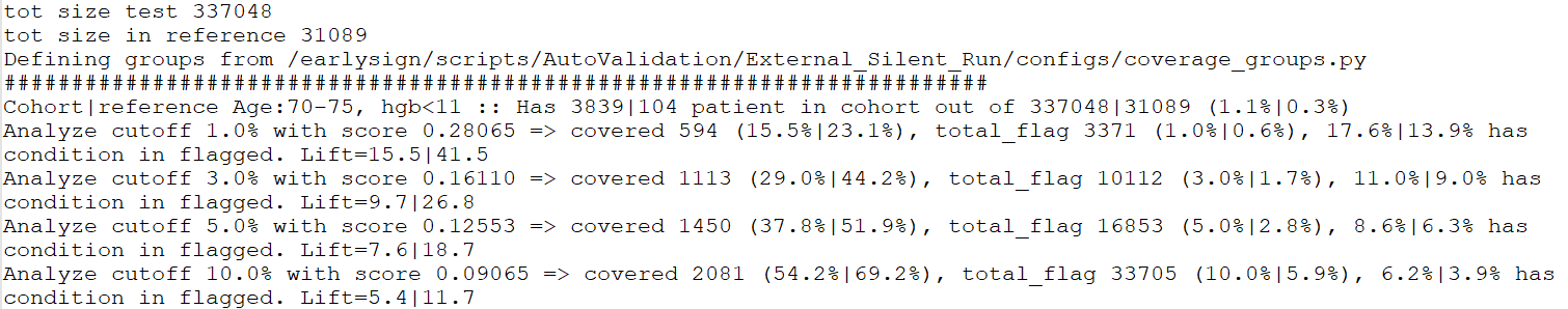 - For each special group and each positive-rate cutoff the test prints: the number covered in the cohort, cohort coverage percentage, total flagged and its share of the dataset, the fraction of flagged who belong to the cohort, and the lift (cohort coverage divided by expected share). When reference cohort filters are provided the test prints equivalent reference numbers and a pairwise lift comparison.