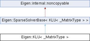 Public Member Functions inherited from Eigen::SparseSolverBase< KLU< _MatrixType > > | |
