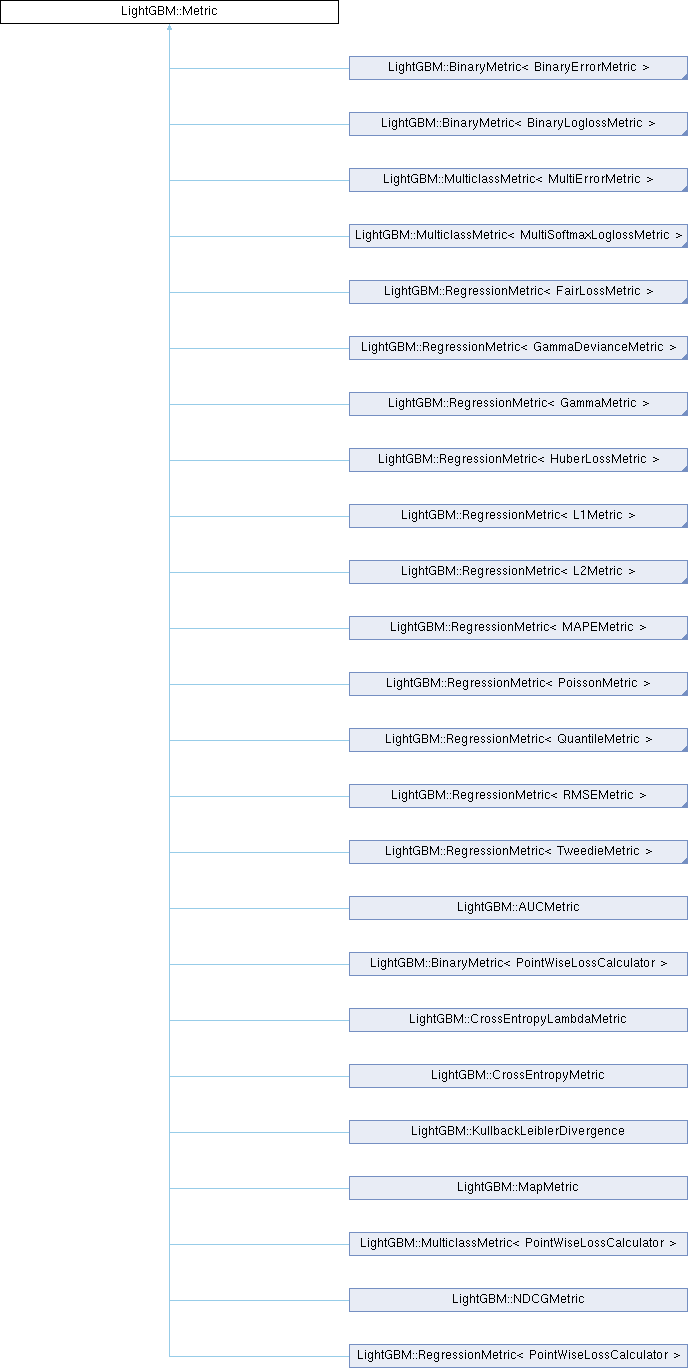 Implemented in LightGBM::BinaryMetric< PointWiseLossCalculator >, LightGBM::BinaryMetric< BinaryErrorMetric >, LightGBM::BinaryMetric< BinaryLoglossMetric >, LightGBM::AUCMetric, LightGBM::MapMetric, LightGBM::MulticlassMetric< PointWiseLossCalculator >, LightGBM::MulticlassMetric< MultiErrorMetric >, LightGBM::MulticlassMetric< MultiSoftmaxLoglossMetric >, LightGBM::NDCGMetric, LightGBM::RegressionMetric< PointWiseLossCalculator >, LightGBM::RegressionMetric< FairLossMetric >, LightGBM::RegressionMetric< GammaDevianceMetric >, LightGBM::RegressionMetric< GammaMetric >, LightGBM::RegressionMetric< HuberLossMetric >, LightGBM::RegressionMetric< L1Metric >, LightGBM::RegressionMetric< L2Metric >, LightGBM::RegressionMetric< MAPEMetric >, LightGBM::RegressionMetric< PoissonMetric >, LightGBM::RegressionMetric< QuantileMetric >, LightGBM::RegressionMetric< RMSEMetric >, LightGBM::RegressionMetric< TweedieMetric >, LightGBM::CrossEntropyMetric, LightGBM::CrossEntropyLambdaMetric, and LightGBM::KullbackLeiblerDivergence.
