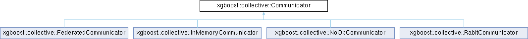 Implemented in xgboost::collective::FederatedCommunicator, xgboost::collective::InMemoryCommunicator, xgboost::collective::NoOpCommunicator, and xgboost::collective::RabitCommunicator.
